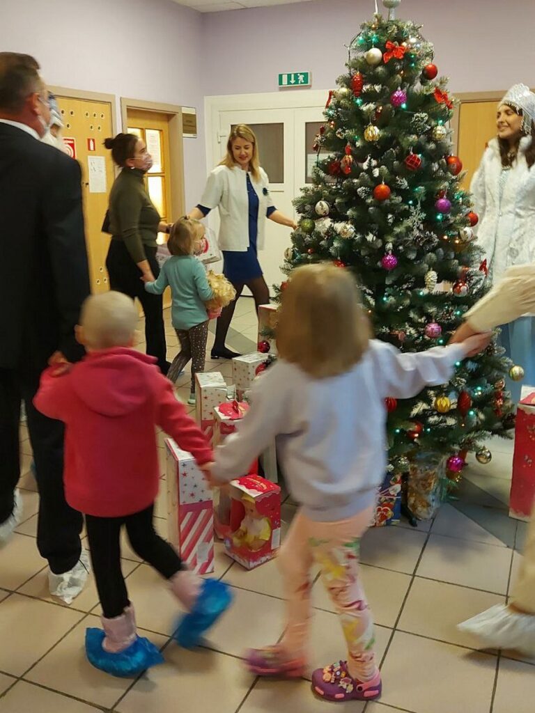 Новогодняя атмосфера и праздничное настроение сразу разлетелись по отделениям Центра. Виктор Ананич поздравил лично каждого ребенка дневного стационара и даже станцевал вокруг елки новогодний хоровод под песню «В лесу родилась елочка».