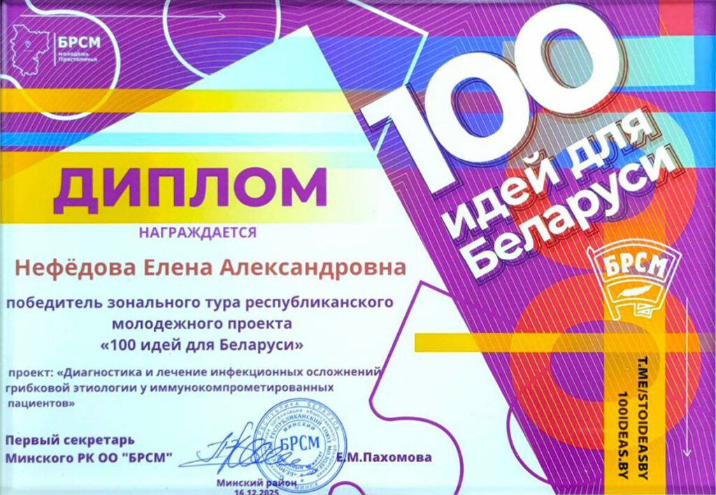 РНПЦ детской онкологии, гематологии и иммунологии успешно  представила и стала победителем зонального этапа врач-детский онколог-гематолог отделения инфекционного контроля Нефедова Елена Александровна с проектом об инфекционных осложнениях грибковой этиологии.